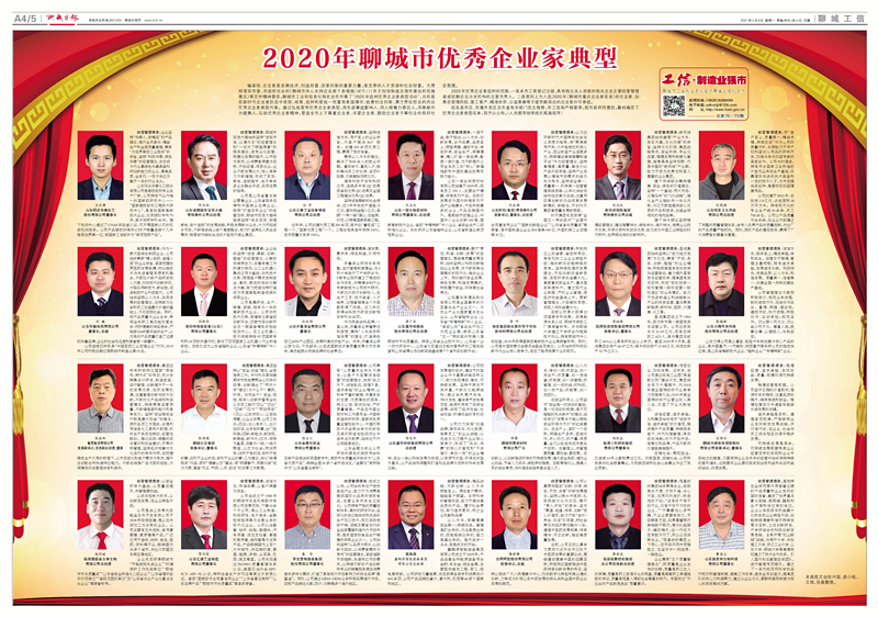 编者按:企业家是发展经济、创造财富、改革创新的重要力量,是宝贵的人才资源和社会财富。为贯彻落实市委、市政府出台的《聊城市关心支持企业家十条措施(试行)》《关于加快制造业强市建设的实施意见》等文件精神要求,聊城市工业和信息化局在全市开展了“2020年选树优秀企业家典型活动”,目的是在新时代企业家队伍中发现、培育、选树和宣扬一批富有家国情怀、锐意创业创新、勇于责任担当的杰出优秀企业家典型代表。通过弘扬宣传优秀企业家典型,用先进事迹影响人,用人格魅力感召人,用奉献作为鼓舞人,弘扬优秀企业家精神,营造全市上下尊重企业家、关爱企业家、鼓励企业家干事创业的良好社会氛围。